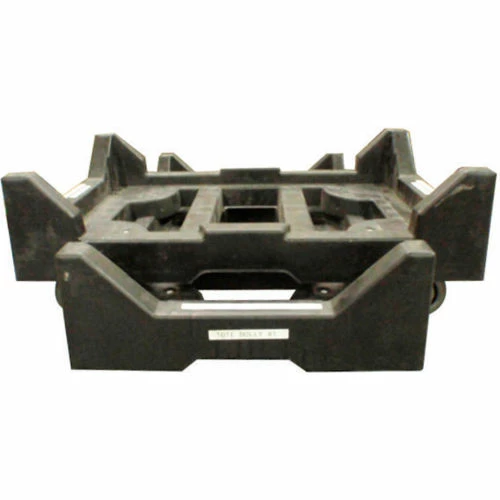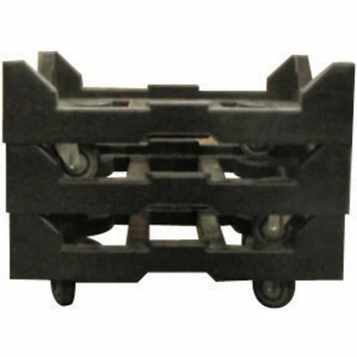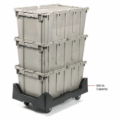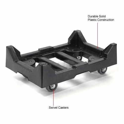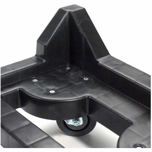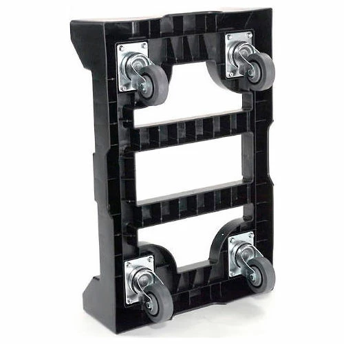 This extremely rugged dolly for shipping containers features a solid black plastic frame and quality non-marking rubber swivel casters. Use indoors or outdoors with distribution containers measuring 27-1/2″ x 16-3/4″ x 12-1/2″ or with straight walled or folding transport containers with a 24″ x 15″ footprint. Dolly measures 27-1/2″L x 18″W x 3″H. 650 lb. capacity.