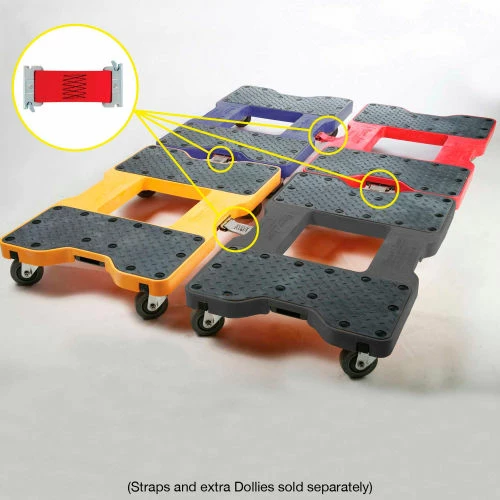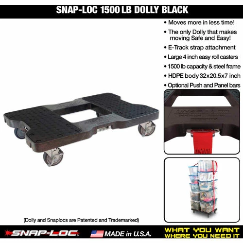 The only Dolly that makes moving enjoyable with easy rolling 1500 lb capacity, optional E-Strap attachment and the versatility to transform into a Push Cart and Panel Cart. Moving your stuff has never been so easy! E-Strap attachment provides the ability to stack more on the Dolly and straps can be used as load control handles Safely Moving More in Less Time! Includes a fully integrated steel frame with four built in SNAPLOCS (E-Track Single strap anchors), ball bearing 4 inch swivel casters (2 with brakes) and flat top cargo grip pads. Multiple Dollies can also be interconnected in any direction for moving larger and longer items. Dolly body and pads are made from long lasting heavy duty Polypropylene and measures 32″x20-1/2″x7″ tall. Optional powder coated steel bars allow for easy conversion into a Platform Truck or Panel Cart. Best of all, the Snap-Loc Dolly is Made in USA for that Ultimate Cargo Control! Snap-Loc also offers a variety of System Accessories, SNAPLOCS E-Track Singles and Straps for most every type of application.