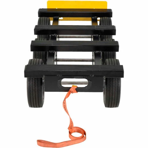 A six wheel dolly can be a major benefit in many conditions. The large oversized wheels give the unit, and any material on board, a smooth vessel to move goods in between areas. Yellow adjustable plate fitted to the rear of the unit. The plate acts as a barrier for items that fit snuggly on the dolly. When the plate is down, it makes room for any oversized products that are too long to fit perfectly square onto the platforms of the dolly. The front of the dolly is an open design that makes it easy to secure any sort of pulling device that may be used. Also included is a strap that can be used to pull the unit, by mechanical or manual means.
