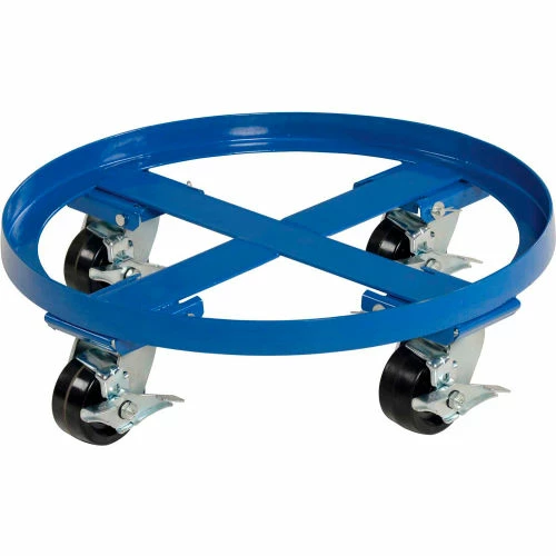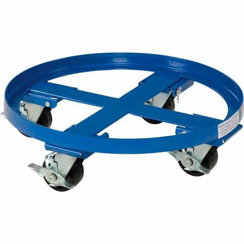 Transport drums with the Heavy-Duty Drum Dolly. This dolly will transport your heavier drums from location to location. Large 4″ diameter Glass-Filled Nylon casters with brakes roll smoothly when loaded. A solid steel construction offers long lasting reliable use.